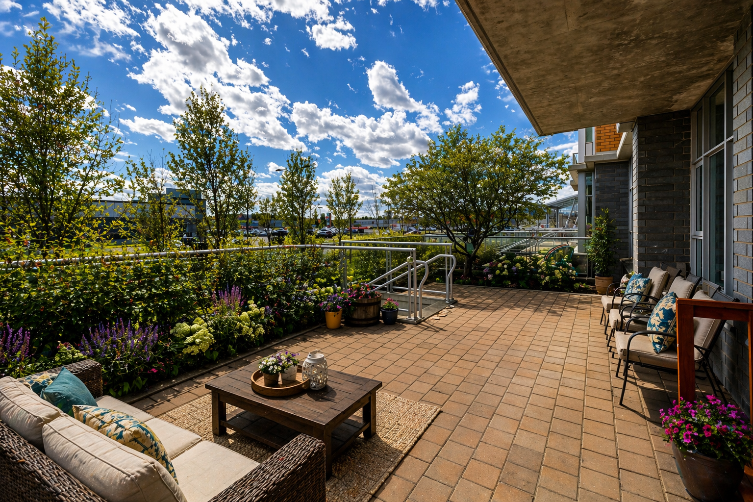 A massive private south-facing patio that lives more like a backyard than a balcony.